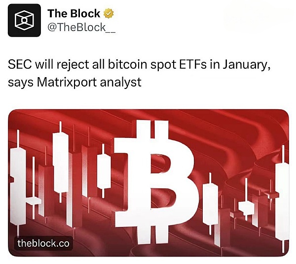 在Matrixport的这份有争议的报告发布后,另一出引人注目的剧情上演了。The Block,作为一家被公认的权威媒体平台,却在未经彻底调查核实的情况下,迅速转载了这一消息:“SEC will reject all bitcoin spot ETFs in January, says Matrixport analyst”。这一行为立即引发了网络舆论的热烈讨论,众多网友对The Block的这一决策提出了尖锐的批评。