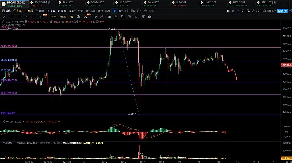 大饼下跌的速度得到多头支撑,早间上下波动剧烈,没有走出很大的区间,各周期均线呈现空头排列,小时线MACD指标死叉运行,并且放量状态,白盘大饼建议43700附近空单,目标42500—41500。