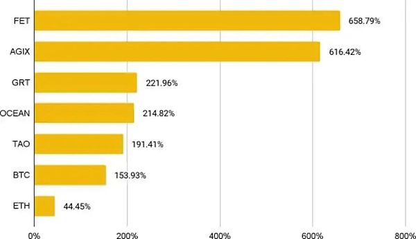 2023 年,市值排名前五的 AI 代币的表现明显优于 BTC 和 ETH,涨幅从 200% 到高达 650% 不等
