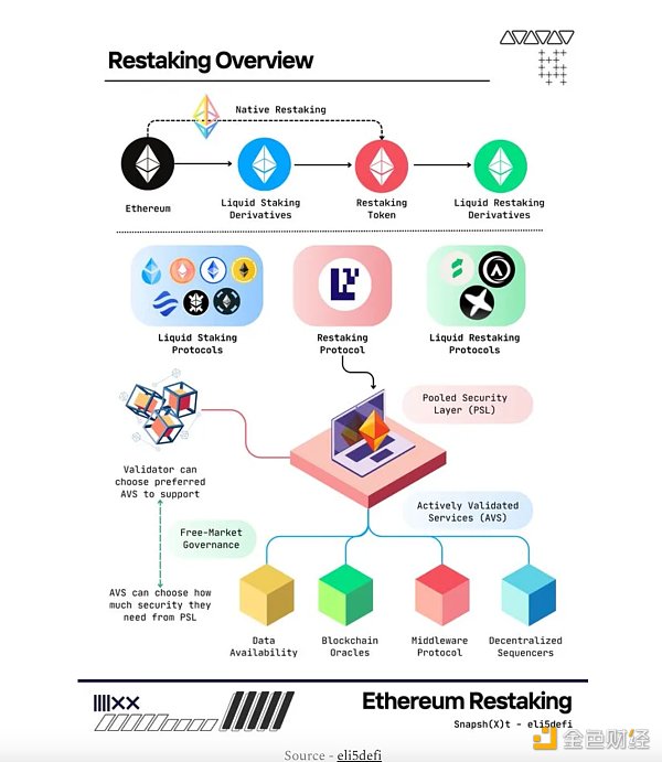 重新质押 (Restaking) 是 EigenLayer 引入的一个新颖概念,服务可以通过它利用以太坊的安全和共识机制。EigenLayer 是一个连接 ETH 重新质押者和 "积极验证服务" (AVS) 的市场平台。AVS 可以是任何类型的服务,从预言机网络到侧链再到桥接,都希望继承以太坊的安全性。ETH 质押者可以通过重新质押他们的 ETH 将其委托给 AVS,从而获得更高的质押收益。本质上,ETH 质押者除了块验证之外,还可以参与数据存储、计算或其他额外的服务。