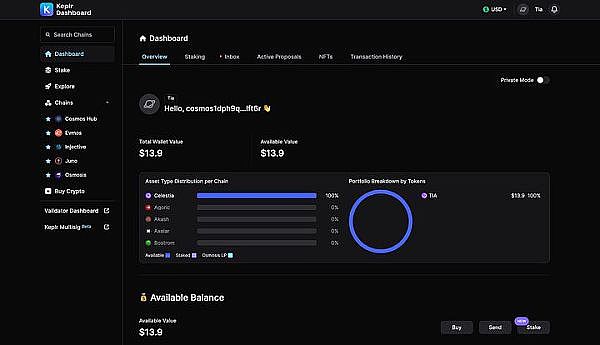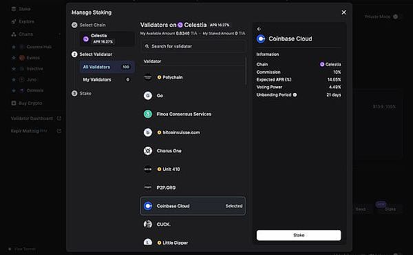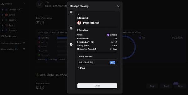目前要在Cosmos生态上进行质押非常简单,只要在把相关代币提到支援Cosmos 生态的钱包Keplr Wallet或Leap Wallet内,即可直接在钱包介面内进行质押,将你的代币委托给验证者,赚取APR 和潜在的空投机会。