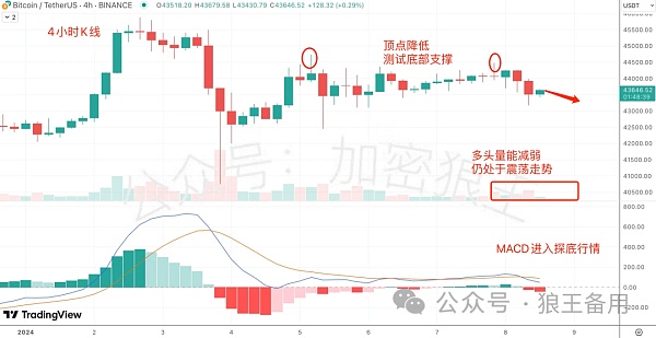 ETF预期再度发酵,多空博弈白热化,警惕市场波动。BTC仍处于震荡走势,BTC沿5日线探底,伴随多头量能减弱,小时线顶点降低,说明存在抛压,上方44552美元是阻力线关键点,只有放量突破44552美元,才能快速拉升走高,接下来BTC下探测试43612美元。
