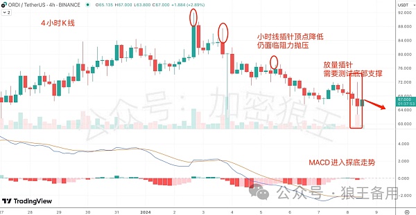 鲸鱼地址异动,对ORDI起到抛压预期作用,ORDI沿5日线探底,仍处于下探走势,上方70.7美元是1.2、1.5日形成的阻力线关键点,只有站稳70.7美元,才能快速拉升突破,重返多头补涨行情,接下来ORDI下探测试63.2美元。