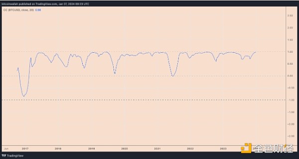 ETH/USD 和 BTC/USD 的每日相关系数图表。 来源:TradingView