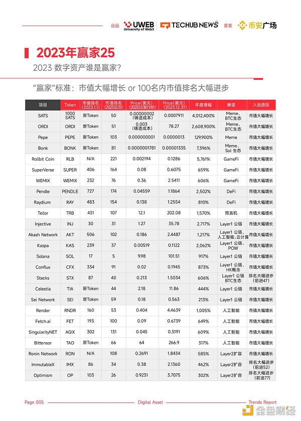 2023年被认为是数字资产市场的复苏之年,市场动态和未来的创新趋势成为了投资者和行业观察者的焦点。为了更深入地理解这一年市场的表现,我们引入了“2023数字资产赢家25”指数,它覆盖了多个领域的数字资产,包括Meme、DeFi、GameFi、Layer1公链、Layer2扩容、人工智能、预言机、BTC生态、Solana生态等,展示了Web3.0生态的广泛性和创新性。