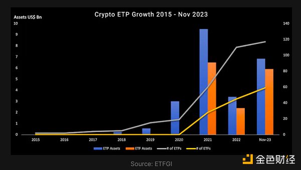 加密货币产品的数量稳步增长,特别是在过去三年内,根据ETFGI的数据,截至2023年11月,加密ETF和ETP达到176种。2023年前11个月,投资于这些产品的资产增长了120%,从 2022 年底的57.9亿美元增长到2023年11月底的127.3亿美元。