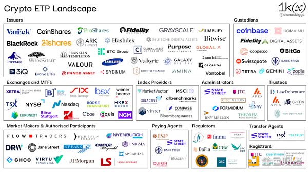 发行人负责 ETP 的整体设计和创建,在整个产品生命周期中协调和管理相关中介机构。对发行人的监管因司法管辖区而异,不一定是必需。然而,监管机构在招股说明书审批过程中对发行人进行评估,交易所在上市过程中也是如此,其中要求可能包括公司治理、资本要求和定期审计。发行人通常设立独立的特殊目的机构(SPV)来发行产品。最初,大多数加密 ETP 发行人都是加密原生公司,例如Coinshares、21Shares、3iQ、Hashdex和Valour,近年来越来越多的传统金融公司加入其中,包括WisdomTree、VanEck、Invesco、Fidelity和等待SEC 批准的公司、贝莱德和富兰克林邓普顿。