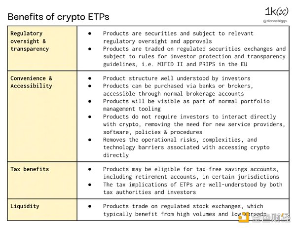 对于加密原生人士来说,加密ETP的想法似乎违反直觉:引入中介机构,而该技术最终使我们能够消除中介机构。然而,作为易于理解和受监管的投资产品,这些产品为更多投资者受众提供了接触加密货币的机会,而这些投资者由于各种原因可能无法访问该资产类别。例如,散户投资者可能缺乏直接投资加密货币的工具、时间、风险承受能力和技术专业知识。ETP 作为传统证券的结构向机构投资者开放,机构投资者可能仅限于投资这些类型的工具,或者出于监管、合规、技术或其他原因希望避免直接持有加密资产。