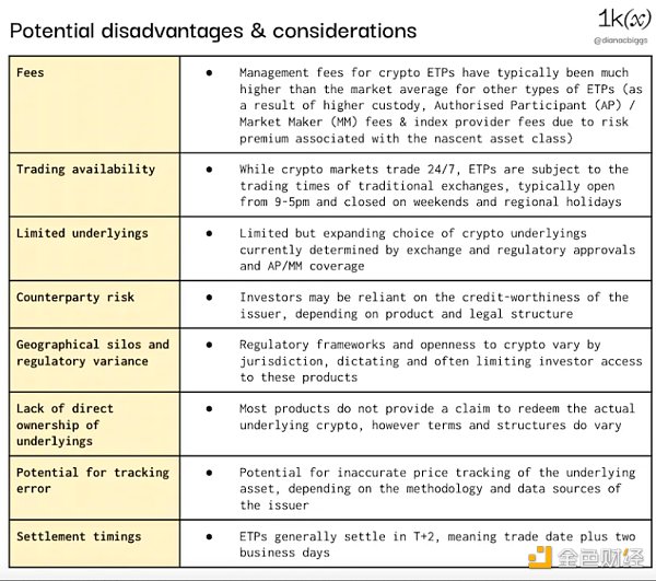 与直接购买加密货币相比,这些产品还存在潜在的缺点和考虑因素(因为并非所有投资者都会认为这些是缺点)。其中包括迄今为止的加密货币 ETP 的费用比这些产品的典型费用高得多(尽管随着竞争的加剧,这些费用已经在下降);传统交易所与加密货币 24/7 市场相比的交易可用性有限;基于根据监管批准、交易对手、跟踪误差、汇率风险以及结算时间确定的司法管辖区和投资者类型。