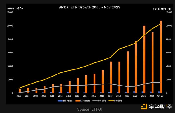 特别是在过去的二十年里,此类产品经历了持续增长,在全球63个国家的81个交易所上市的718家提供商中,已达到11,859种产品和23,931种上市;其中,ETF占资产的最大份额,占107,470亿美元,占ETP资产总额 109,900 亿美元的98%(数据来自ETFGI截至2023年11月底)。奥纬咨询 (Oliver Wyman)预计ETF的增长将在近年来加速增长,预测2022年至2027年市场将以每年13%至18%的速度增长。