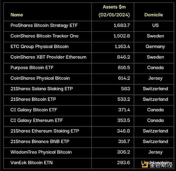 按资产管理规模计算,最大的加密货币 ETP 是ProShares 比特币策略 ETF,这是一款总部位于美国的期货产品,根据截至 2024 年 1 月 2 日的可用数据,持有资产为 16.8 亿美元。