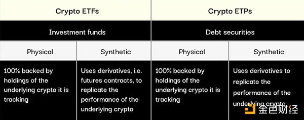 从广义上讲,加密货币ETP分为两种产品类别:ETF或ETP;两个产品类型:实物(也称为资产支持)或合成。