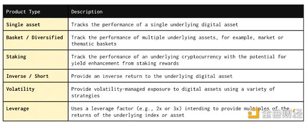 加密货币ETP最初是作为单一数字资产跟踪产品开始的,如今,市场上提供的加密货币 ETP 范围还包括单一资产、一篮子资产、质押、反向和杠杆产品,以及旨在管理波动性的某些指数。