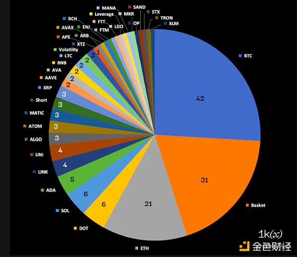 从底层证券来看,根据BitMEX Research最近整理的数据,剔除股票和场外交易基金,再加上额外数据,我们发现,在 162 个加密货币 ETP 中,比特币、以太坊和篮子产品占比 58%,其他产品占比 58%。 42%由长尾单一数字资产,以及空头、波动性和杠杆产品组成。
