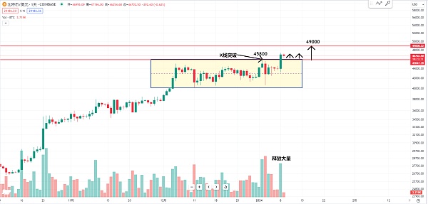 昨天这根K线突破也是有大量能释放 短线这个位置最好是赶快整理2根 然后第三根赶快继续突破47000 然后下一个压力位有可能就是49000 不过短期在这个位置我们也要去观察 他不能又回到这个45800的下方 如果回来的话 我们就要防止比特币主力会不会又在这个区间里面继续盘整