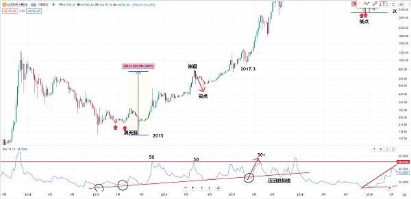 或者我们可以观察一下比特币在2015年的牛市也是一样 一个低点和一个低点都是在走低 然后下方dmi指标早就在底部的第二个低点就要开始启动一波上涨 但是后面在这里也是有一个黑天鹅事件 后面也是跌出了一个低点