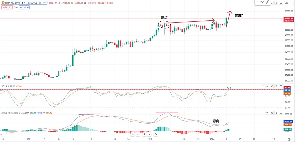 当然现在我的观点是我们要留意他不要拐弯 就是这个位置最好是赶快再次突破47000 或者是如果突破47000之后有没有可能去到49000 把48000也突破 但是我的观点是短期我们尽量要留意 这个位置最好是赶快突破 有可能kdj指标也会进入80