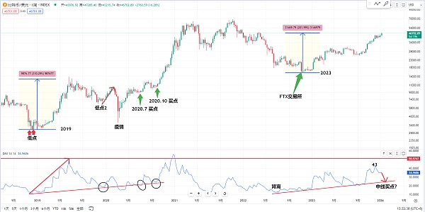 然后我们观察一下比特币周线的这个DMI指标 历史上每一次的牛市在DMI指标上面好像都会有趋势线在这边 2023年的牛市这个趋势线每一次回撤的低点都是非常重要的买点