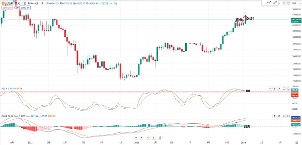 不过从这个高点涨上去就是价格过高 其实指标也是在低点的位置 或者是现在比特币价格再一次创造新高 然后这个macd指标在短期也是有一点背离 包括我们可以观察一下日线的这个kdj指标