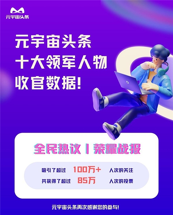 元宇宙头条“十大领军人物”评选活动的成功举办,离不开广大用户的热心参与和支持。感谢您们共同见证了这场数字时代的盛事,为元宇宙的发展注入了新的活力。