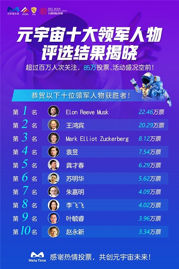 自活动启动以来,我们收到了海量的投票,吸引了超过百万人次的关注。此次评选共获得了超过85万票,并有众多精英参与了本次元宇宙十大领军人物的评选活动,为本次活动增添了辉煌光彩!