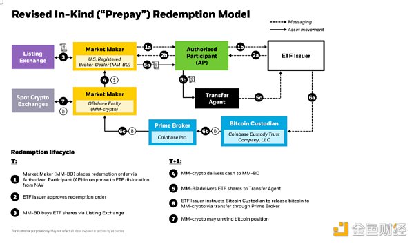 · 现金交割(“现金流创造”):现金交割就像“预付”一样,增加了成本(费用和税),这种成本的增加将转嫁给散户投资者,使购买比特币比购买ETF更具吸引力。这些成本包括买卖价差、计算、执行和核算比特币市场交易所涉及的运营成本。这可能会让小型AP顾虑重重,并使他们的投资天平向资产负债表上拥有数万亿美元的大银行倾斜。下面的流程图来自于Blackrock最近的一个文件。