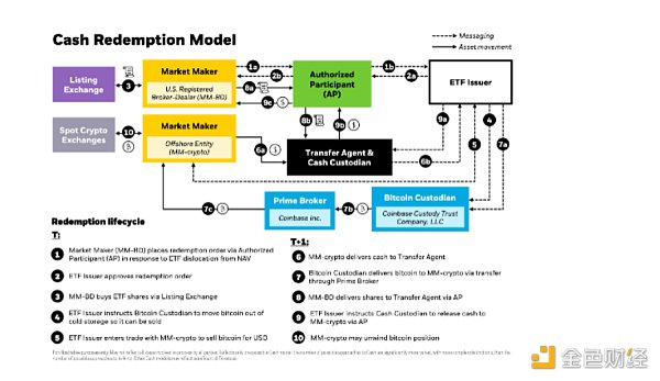当授权参与人(AP)想要购买(创建)ETF新股以履行交易订单时,现金流创造要求发行商从授权参与人(AP)那里接收现金。请注意,AP是代表经纪商(BD)的散户投资者(你我)执行交易的经纪商, SEC和FINRA都没有批准这些经纪商交易现货比特币资产。