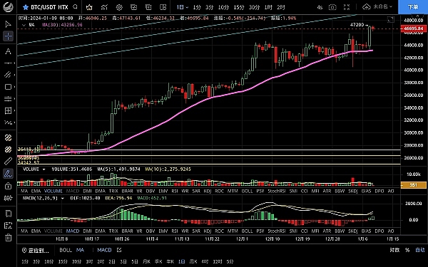大饼昨日最低跌至43195一线支撑,随后行情一路反弹上行突破新高,最高触及47200一线受阻,恭喜跟上低多思路的朋友,最大获利4000点,目前币价在46760附近运行,四小时级别k线大阳拉升后未能延续多头走势,短期行情受阻回落,有修复ma7均线的需求,行情震荡时间较久此次突破打开上方空间,macd多头逐步放量双线金叉向上,走势依旧偏向多头,日线级别多头趋势未被打破,k线四连阳向上拉升,虽短期滞涨回落但多头依旧强势,日内需关注回踩力度然后逢低做多,重点关注etf消息面,不管通不通过切记做好风控,上方压制47200-48300,下方支撑46500-45800