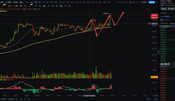 距离现货ETF获批越来越近,明日就会出结果,市场都在等待这个消息,大饼昨晚也是迎来突破反弹,最高点位在47283位置,昨日已经提示大家市场多头情绪浓重,行情晚间突破机会很大,预计会到47000,大饼不负所望到达47000附近;以太也走了一波反弹,虽然没有到达2385位置,但最高点到达2359位置,多单也是有一定利润的,恭喜跟上笔者脚步的朋友再次获利;明日就是现货ETF获批的日子了,明日反弹的机会还是更大,但今日还是有回调机会;