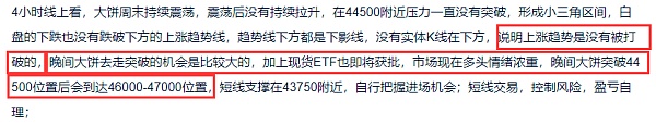 大饼反弹到达47000附近,该位置是存在一定压力的,行情到达后也没有继续去拉升,而是在该位置收两根十字星,说明短线上空头还是有一定的力量,日内继续去追涨不是很适合了,等待一波回调后再去做多单的布局,大饼日内回调区间预计在44180-43350,还有2000多个点的下跌空间可以去做空单的尝试,轻仓带止损去做即可,自行把握进场机会;短线交易,控制风险,盈亏自理;