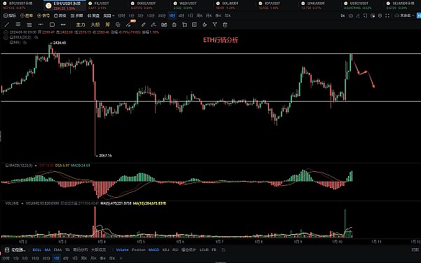 以太走出独立行情,从2250下方直接反弹到2400附近,2400—2450区间前期多次试探高点并没有破位,上涨只是强反弹,没有缓慢拉升,短期急拉诱多的情况较多,建议2400附近空单,目标看到2300—2250.