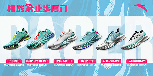 与展台相同配色的"云海"跑鞋矩阵也同时亮相,覆盖安踏"前掌之王"C10 PRO、C202 5代 GT PRO、C202 5代 GT、C202 5代、安踏⻢赫4代,与安踏创跑5代等六款主力鞋型,满足从大众跑者直至精英跑者日常慢跑、竞速训练与竞赛的全线需求,适配全马不同完赛时间的选手。而独特云海配色传递出的"会当凌绝顶"的概念,看到漫无边际云彩的满足感,寓意着⻢拉松跑者在挑战完42.195公里后,犹如登顶成绩"山峰"后内心充盈的成就感。