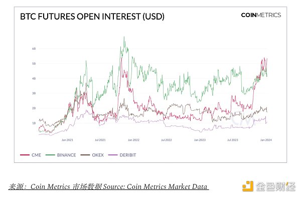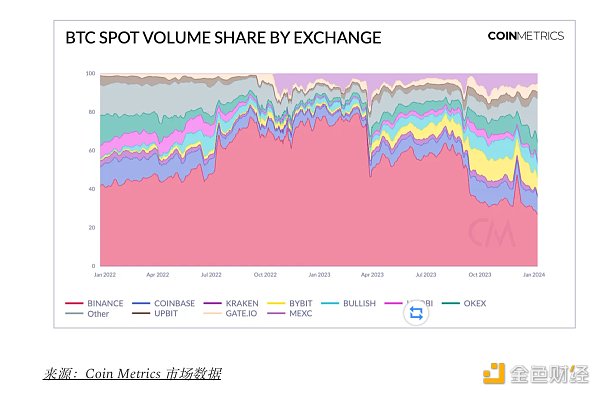 各交易所BTC现货交易量份额显示,交易所格局日趋分散。这反映在币安的统治地位从Q1的超过75%下降到2024年1月的30%以下。其他交易所,例如Coinbase和Bullish,因此获益,导致中心化交易所的交易量更均衡地分布。