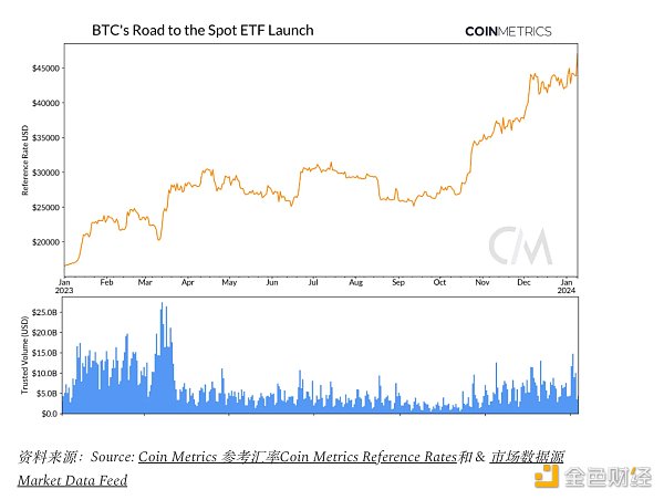 这股热情也反映在比特币的价格上,2023年飙升了156%。尽管可信赖的现货交易量在第一季度回升,但3月硅谷银行危机后陷入停滞。然而,随着对ETF的期盼升温,交易量再次攀升,目前平均约为100亿美元,但仍低于FTX崩盘前的水平。比特币的流动性仍然是实现该资产高效交易的关键因素,尤其是在即将推出ETF的情况下。
