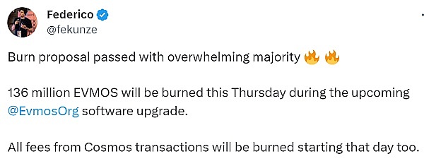 在此之前,Evmos首席执行官Federico在X平台发表讲话,宣布了一个关于EVMOS销毁的提案。这个提案以多数赞成票通过,并将在本周四即将进行的Evmos软件升级期间实施。届时,将有高达1.36亿枚EVMOS代币被销毁。此外,从当日起在Cosmos网络上进行的所有交易,其交易费用也将被销毁。这一举措不仅展示了Evmos对其代币价值和供应量的管理,而且反映出对网络健康和可持续性的考虑。