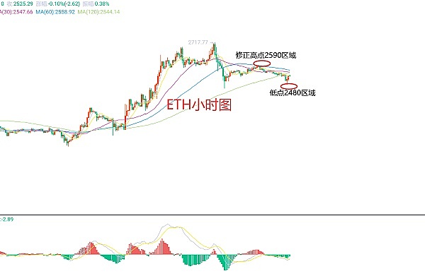 1月15日以太坊(ETH)合约技术面分析:今日方面,大周期日线级别昨日报收小阳线,K线形态上连阴单阳,但价格还是在高位处于均线上方,整体还是比较强势的,附图指标金叉运行,那么当前我们去分析就要注意回撤修正的概率以及要注意回撤力度的大小和延续性的问题,交易上还是保持短线;短周期小时图上周回撤低点在2460区域附近,周末修正的高点在2590区域附近,当前价格在区间内震荡K线形态没有延续,附图指标死叉看不到力度,那么日内大概率还是震荡修正为主,因此今日ETH短线合约交易策略:回撤2480区域多,止损2460区域,目标看2520-2540区域,反抽2540区域空,止损2560区域,目标看2500-2480区域