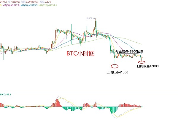1月15日比特币(BTC)合约技术面分析:今日方面,大周期日线级别昨日报收小阳线,K线形态上连阴单阳,但价格还是在高位,前期走势上冲高回落,所以当前的回撤我们需要考虑的有回撤修正需要关注的是回撤的力度大小和延续问题;所以在建议上还是要继续保持短线,切不可因为贪心而导致获利回吐,影响心态;短周期小时图在周五价格出现较大下跌回撤,周末维持了横盘整理,而当前延续下跌,K线形态连阴,价格在均线下方,附图指标死叉运行,低点位置在41360区域,修正高点在43300区域,而当前低点在42000区域附近,这样来说今日还是看区间震荡走势,因此今日BTC短线合约交易策略:回撤42000区域多,止损41700区域,目标看42600-42800区域,反弹43000区域空,止损43300区域,目标看42400-42200区域;