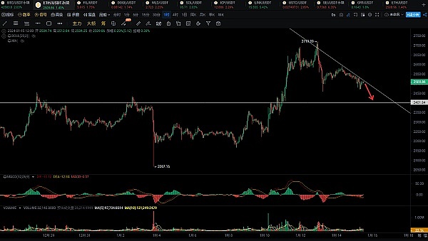大饼周末处于横盘,小幅下跌,但是以太跌到2500下方,小时线去看反弹比较弱势,成交量不足,并且MACD在零轴下方运行。均线逐步变成压力,布林带开口向下,短期没有大跌,可是趋势已经走坏,日内思路还是高空为主。关注上方压力2520附近,刚好是布林带中轨区域,建议反弹2520附近空单,目标看到2450—2400;大饼是下跌之后反弹上来的,那么趋势还是空头占优,建议42600附近空单,目标41500—41000.