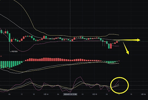 这两天行情一直处于中下轨运动,目前BTC在42500,ETH在2500一线,处于中轨下方,一直未能突破,BOLL轨道张口下行,MACD并行,KDJ运行在超买区,有拐头向下趋势,结合数据分析,下午操作洪伟个人偏向于空单。