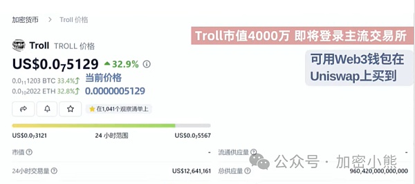 目前市值仅几千万的这个币尚未登陆主流交易所,因此它有潜力成为未来的新百倍币。TROLL币的共识相较于其他币种更为强大,因为它本身就是一个互联网梗,拥有庞大的用户基础。再加上它的发源地——首富马斯克,因此它的发展空间可能更加广阔。