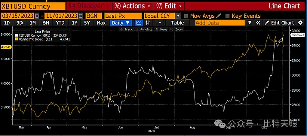 在2023年的灰烬中,美国治下的和平及其附庸国显然无法继续收紧货币政策。这样做会使整个系统破产,因为杠杆和债务负担太高。随着美国长期国债收益率开始阶梯式走高,一件奇怪的事情发生了。比特币和加密货币上涨,而债券价格下跌。