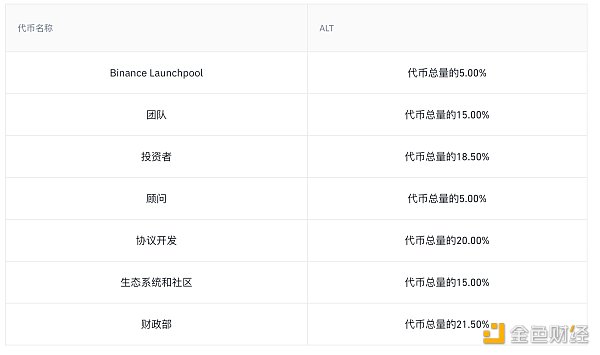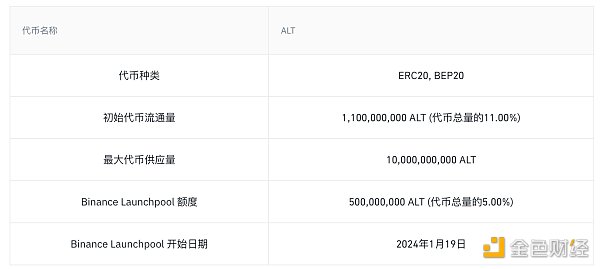 截至2024年1月17日,ALT的最大供应量为100亿,上市时的流通供应量将大约为11亿(占最大代币供应量的约11.00%)。