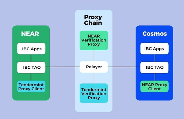 以 NEAR-IBC 为例:在代理链/ Proxy Chain 上部署了 Cosmos 和 NEAR 的验证代理,维护对应链的共识,然后在跨链双方再部署一个对方共识机制的代理客户端,替换 IBC 原来的轻客户端。