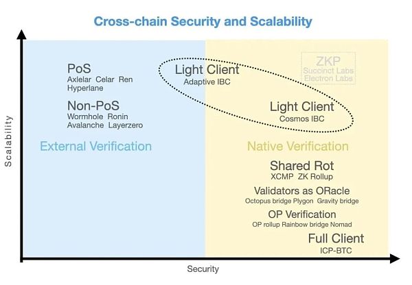 IBC 协议的架构基于轻客户端,所以无需引入第三方的验证服务,实现了无信任/ Trustless 跨链。尤其是在 Cosmos 链之间取得了安全性、成本和速度的极佳平衡,但是在延伸到异构链时,很多团队都是肉眼可见的进展缓慢。