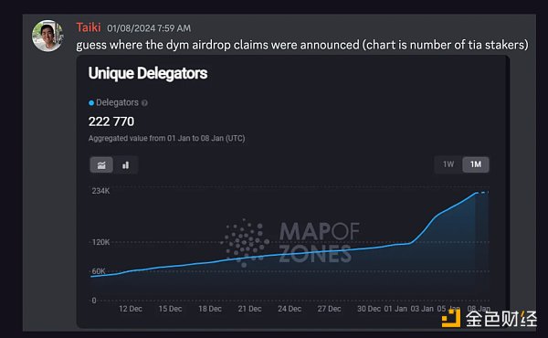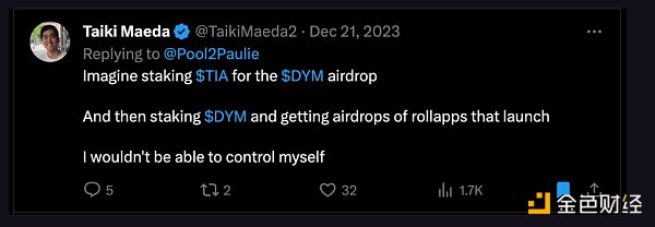 另一方面,DYM 则是一个平等主义的空投,在 12/19 进行快照,最低 TIA 质押量为 1。这意味着你可以质押 20 美元的 TIA 并获得价值约 1000 美元的空投。他们还向 Pudgy Penguin 和 Solana NFT 社区空投了代币。你只要在 Twitter/X 上搜索“$DYM”,就能看到一个强大的社区,甚至是在代币发布之前!这就是应该做的方式。这里有一个关于 DYM 应该值多少钱的精彩讨论。