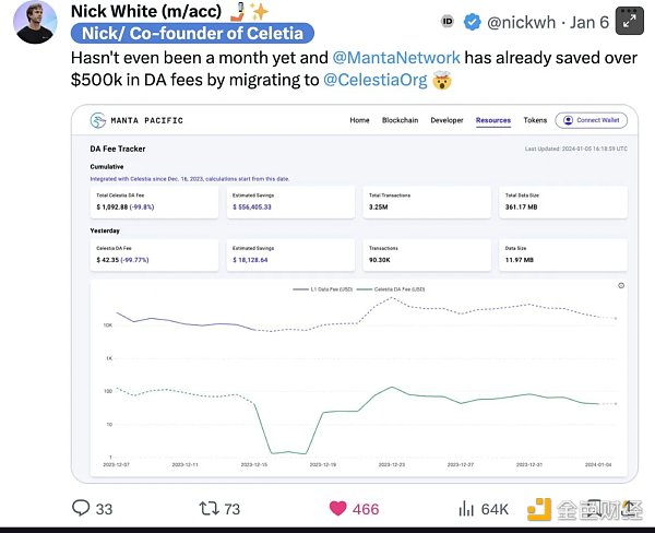 这份报告如果我尝试详细解释 Celestia,会变得冗长,所以我只推荐由 Nosleepjon 写的精彩文章。简而言之,Celestia 分解了区块链堆栈,专注于数据可用性层。这使得新项目部署新的 rollups 和区块链变得更加容易和便宜。例如,Manta Network 通过使用 Celestia 的数据可用性替代以太坊,实现了 99.8% 的费用降低!