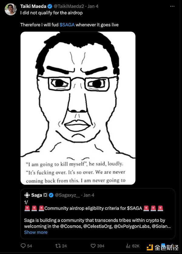 上面的推文有点像个玩笑,但也是认真的。SAGA 团队和风险投资公司尽最大努力让空投尽可能难以获得,例如在 12/1 对 TIA 质押者进行快照,最低质押量为 23。空投的目的是奖励社区。他们真的认为在 TIA 代币启动不到一个月后就会形成一个 Celestia 社区吗?Celestia 社区现在才刚刚开始形成,所以未来的项目应该停止通过非常早的快照来中途扼杀空投。SAGA 的空投团队和风险投资公司将其极大地推向了中间曲线。