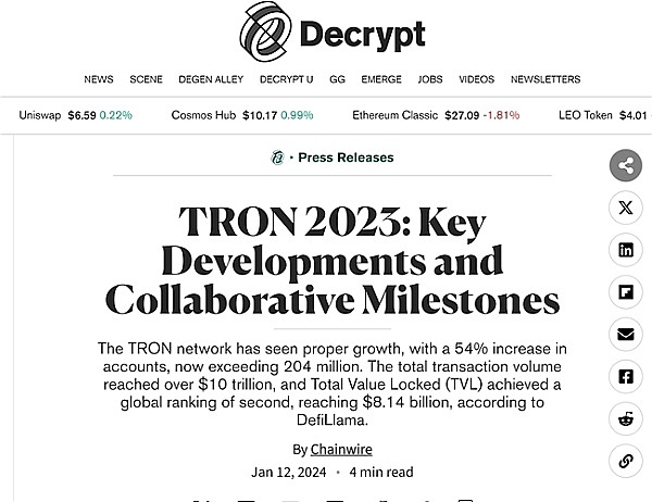 近日,权威外媒The Block、美联社和Decrypt等就波场TRON 2023大事件进行了年度盘点。报道指出,波场网络在2023年取得了一系列的发展和合作,提升了其在Web3领域的地位。其中,波场网络账户数量增加了54%。超过2.04亿个。总交易量超过10万亿美元,根据DefiLlama数据,锁定价值(TVL)达到全球第二名,达到81.4亿美元。