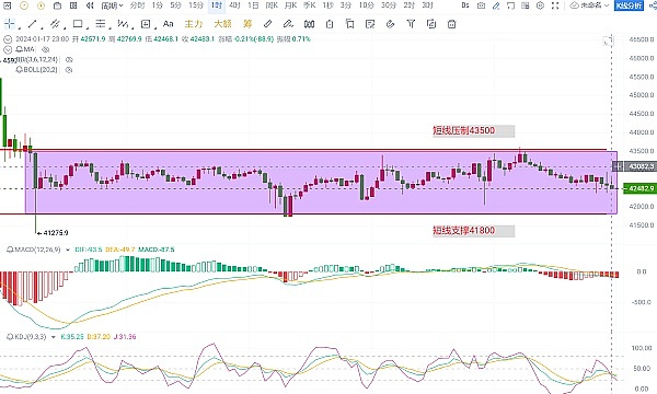 比特币小时图盘面可以看见,目前行情走出了一个明确的箱体,整体来看这个区间属于多空双方筹码密集交换区,这也是因为前一段时间比特币的行情冲高,导致多头筹码套利离场、空头筹码直接被拉爆,目前行情进入了一个筹码的真空期,不论是多头还是空头当前都需要时间和空间来进行筹集筹码,导致行情本周一直围绕着箱体区间盘整,我们的操作思路可依据箱体区间去把握,短线上方的压制位在43500附近,下方的重要支撑关注41800一带。结合附图指标来看,MACD当前不论是多头还是空头都出现放量不足,整体动能偏弱围绕零线附近运行,KDJ方面三线走平缓慢缩口,有粘合向下的趋势,从四小时图上看会更为明显,这也衍生出了我对行情的整体看法,稳中向下,预计接下来行情会以慢跌为主。