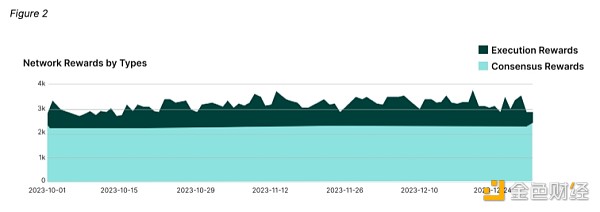 CL 奖励分配给验证者,用于证明、提议区块和参与同步委员会。 证明区块是一种经常发生的情况,主要是由验证者的参与率驱动的,这将在报告后面讨论。 Figment 在第四季度的 CL 奖励中值表现为每个验证者每天 0.002282 ETH,略高于网络中值每个验证者每天 0.002279 ETH。 如果验证者被选中提出区块,他们也会获得 EL 奖励。